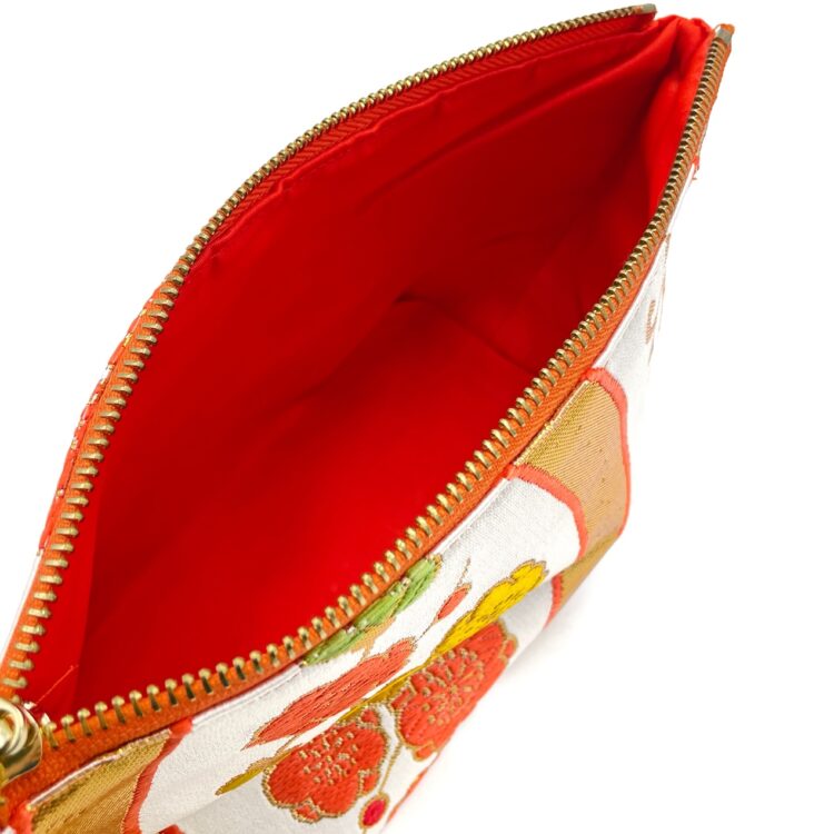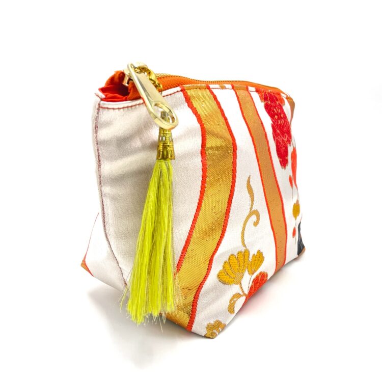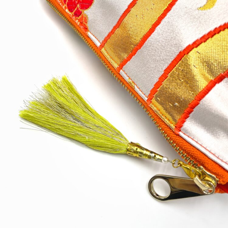 Toanoi’s Kimono Pouch. Crafted from authentic obi fabric, this bag holds the elegance of traditional artistry. Each pouch is handmade, ensuring a completely unique creation that embodies the rich heritage of Japanese craftsmanship. The interior features an obi silk lining, adding a little extra luxury. The spacious interior and big inner pocket provide ample room for all your needs, while the sturdy zip guarantees its all secure. A matching tassel completes the design, offering a blend of functionality and style. The perfect bag for those who appreciate both pretty and practical.