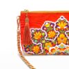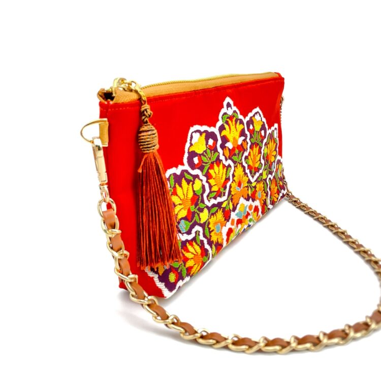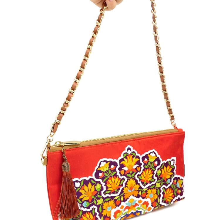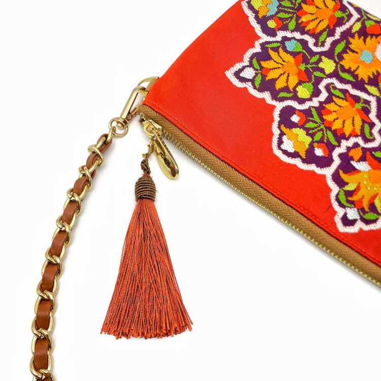 Toanoi Japanese Kimono Short Chain Shoulder Bag. Expertly handmade from vintage obi fabric, this bag combines a nylon lining, a smooth zipper, and a decorative tassel for strength and durability. Each piece is unique, crafted with care, and utilizes recycled obi belts from Japan to create an eye-catching evening bag that’s perfect for any occasion.
